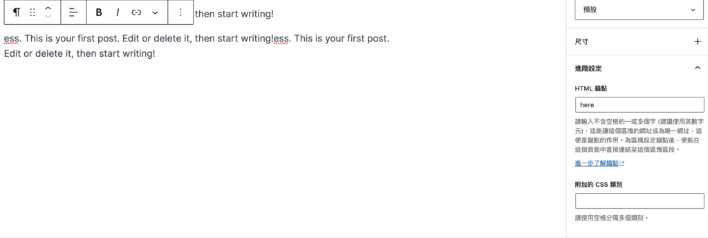 選擇你預計要 跳轉抵達 的區塊,並找到進階設定裡面的 HTML 錨點,並為此區塊的錨點命名,一定要命名英文喔!任何名稱都可以,同一個名稱只能使用在一個區塊,不能使用在其他區塊,不然就會出現跳轉錯誤。 在這裡示範我輸入 here 當作我的錨點名稱。 選擇你要製作的超連結文字,並輸入...