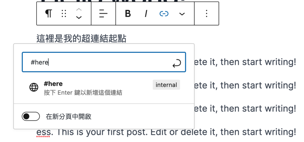 選擇你要製作的超連結文字,並輸入 # + 你取的名稱,在這裡我輸入 #here